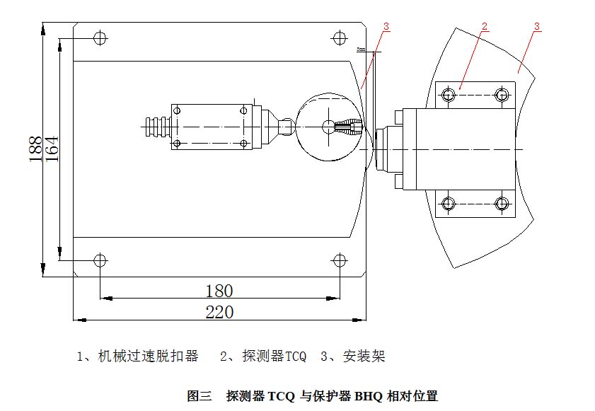 3、安裝過速保護器BHQ(由業(yè)主自己根據(jù)現(xiàn)場情況配裝,應有足夠的空間供保護器完成手動復位)及過速保護器BHQ的安裝螺栓不能完全緊固,以便于后面調(diào)整,安裝時要求液壓閥中心高度與過速探測器在同一高度,同時脫扣裝置的一邊與主軸中心線重合(如圖三),然后鎖緊螺栓。