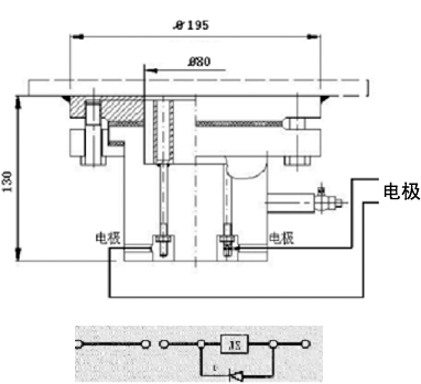 1、電極裝置安裝于油箱底部,開口尺寸φ80,信號(hào)裝置安裝在便于觀察使用地方,二者間宜用屏蔽電纜連接并在一點(diǎn)接地。裝于油箱底板的電極裝置有4個(gè)電極,可分別并聯(lián)使用其中兩個(gè)。