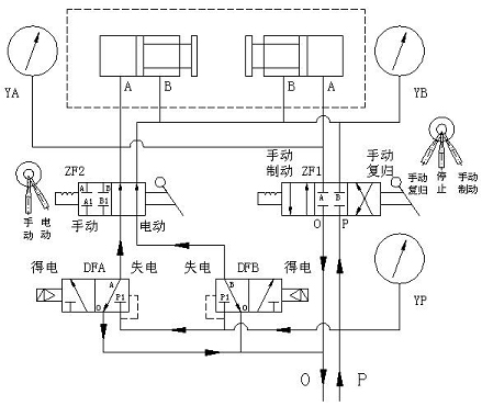 1、自動回路:將手動轉閥ZF1的手柄扳到停止位置,手動轉閥ZF2的手柄扳到電動位置,壓縮空氣進入電磁換向閥DFA、DFB的壓力腔(進氣腔),并密封在壓力腔內,左、右工作腔與排氣腔接通。